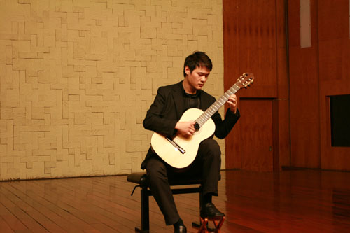 本院在读硕士研究生台湾学生华启洋同学于11月3日在小音乐厅举办了个人古典吉他独奏音乐会。他于2008年考入我院攻读硕士研究生专业,也是我院招收的第一位台湾硕士研究生。之前曾获得2006年济南吉他邀请赛成人组亚军,现其专业指导教师为现代器乐系的徐宝老师。