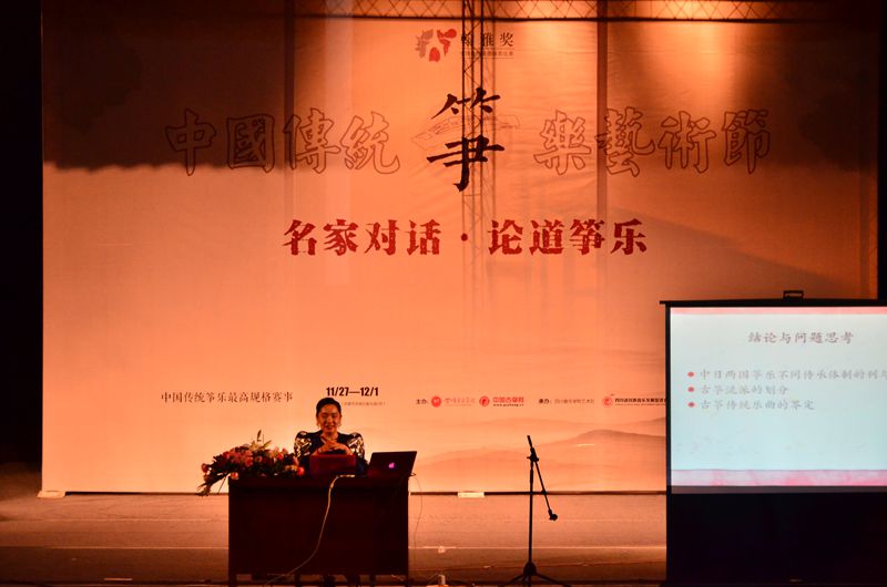 2016中国传统筝乐艺术节暨第二届翰雅奖·中国传统筝曲演奏(成都)邀请赛第二天,共邀请到4位名家进行讲座,毛丫老师主讲了《中日两国传统筝曲传承现状比较研究》,张俪琼老师主讲了《筝乐作品中的台湾传统韵响》,王培瑜老师主讲了《乐说潮州弦诗与潮州筝曲的因缘和合》,景建树老师主讲了《<望秦川>的创作背景与作品分析》。各位名家以言语深入浅出、风趣幽默令到场观众受益匪浅。