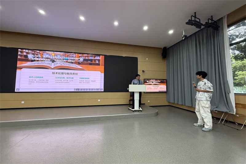 在讲座的尾声,马欣教授与学生展开了互动。针对“技术是否将弱化人文内涵”的提问,他指出:“人文是行业的灵魂,技术应为其服务。”现场的学生为此展开了深入讨论,播音系同学都很认同“技术拓展了表达形式,但内容深度以及根基所在仍需人文积淀”这一观点。