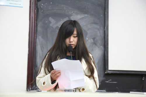 大会由学生会副主席马文淼同学主持,在学生会主席郑海怡同学的一段诙谐幽默的说唱中开场,气氛一下子便活跃起来,同学们对主席的表现都乐不可支。之后,大会播放了由学生会宣传部制作的学生会工作实绩照片流和学生会新年祝福视频,展示了这届学生会自组建以来近3个月所开展的一系列工作和学生会干部们对所有成员们的祝福。回顾过去3个月的工作,后方书记与张旭老师认真观看并频频点头。同学们回首往事感慨交加,展望新的一年,也都充满了期望与信心。