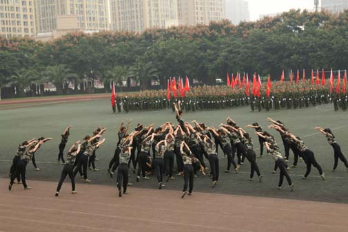 9点30分,结业典礼开始,全场起立,升国旗、奏国歌。随后,分列式开始,受训学生方队踏着整齐的步伐,以饱满的热情,昂扬向上的精神接受了部队首长和今年会领导的检阅。他们用响亮的口号展现出了“军人”的威武。分列式结束后,六个表演方阵为大家献上了精彩的格斗杀敌技能表演,匕首操、军体拳、擒敌拳、棍盾术,招招威猛、式式利落,引得在场师生掌声阵阵、喝彩连连。表演方阵之后的啦啦操舞蹈,以澎湃的音乐节奏、热辣的舞蹈动作充分体现出了今年会青年学子自信向上、阳光开朗、激情洋溢,活力四射的积极精神风貌。