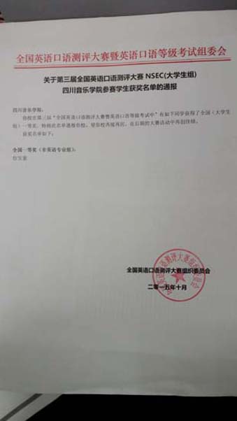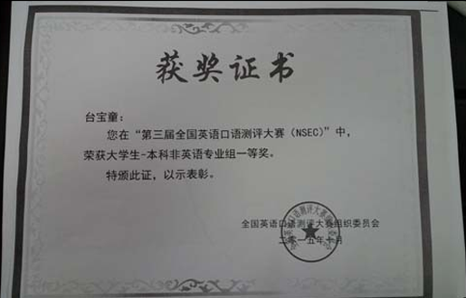 我院2012级学生台宝童在第三届“全国英语口语测评大赛(NSEC)”的激烈角逐中,荣获了大学生本科非英语专业一等奖! 再次,恭喜台宝童同学能够在大赛中脱颖而出,为我院争创辉煌! 特此公示,以示鼓励!