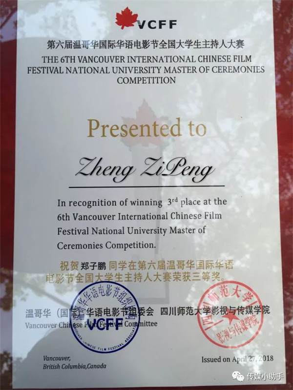 祝贺我院学生郑子鹏在第六届温哥华(国际)华语电影节主持人大赛中获得三等奖