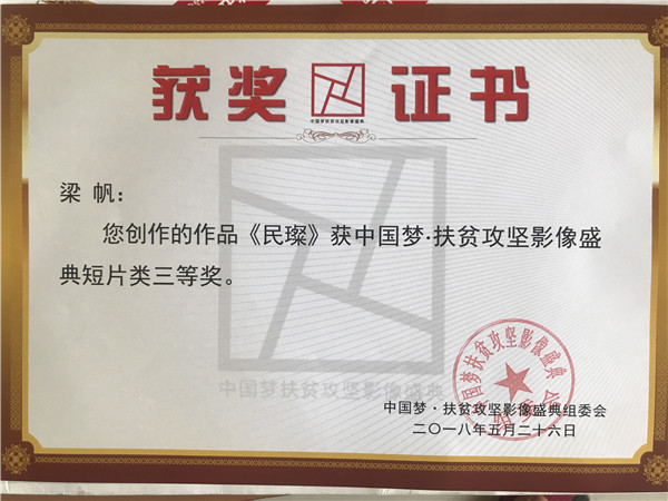 2018年5月26日,“中国梦·扶贫攻坚影像盛典”在山东省枣庄市启动。本次影像盛典活动作品征集从2017年10月份开始,参加展映作品来自全国各地电视台、影视机构和部分高校。作品内容涵盖了精准扶贫、对口扶贫、信息扶贫、杜绝返贫、搬迁、支教、支援农村医疗、扶志扶智、科学种植养殖等。 来自全国各地的2300多部纪录片、剧情片、经验汇报片、动画片和微视频汇聚一堂,生动鲜活地反映了精准扶贫工作在中华大地的扎实推进和丰硕成果。其中,由我院开明映像学生工作室梁帆、余浩然同学以及传媒之韵大学生艺术团卜一桓同学主创的作品《民璨》获中国梦·扶贫攻坚影像盛典短片类三等奖,充分展现了我院学生扎实的专业功底和优秀的创作才能。 本次影像盛典的目的在于在广大电视、影像从业人员尤其是在青年一代中,发起一次全面贯彻落实党的十九大精神、加快新时代精准扶贫攻坚步伐的专题宣传教育活动。创作者在充分利用新媒体、微视频呈现扶贫攻坚工作中鲜活、感人的故事的同时,自身也得到了一次深刻的精神洗礼,进而能够为精准扶贫攻坚工作贡献自己独特的力量。
