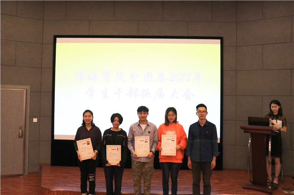 接下来党总支副书记后方为2017届学生会主席团及各部门部长颁发任职证明,场下掌声雷动,表达了对主席团成员和各部长为传媒学院工作热情奉献的高度认可。