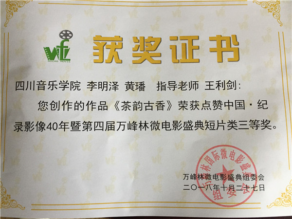 2018年10月27日第四届万峰林微电影盛典颁奖晚会在云南昭通举行。本次活动由中国文化信息协会国际影视文化交流专业委员会、中国社会科学院新闻所世界传媒研究中心和中国高校影视学会联合主办。我院影视摄影与制作专业2017级李明泽、黄璠同学的作品《茶韵古乡》荣获三等奖。