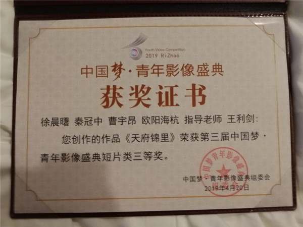 4月20日至21日,由中国文化信息协会国际影视文化交流专业委员会、中国社会科学院新闻与传播研究所世界传媒研究中心、中国高等院校影视学会等单位联合主办的第三届《中国梦•青年影像盛典》在山东省日照市举行。传媒学院2017级影视摄影与制作专业徐晨曙、秦冠中、曹宇昂、欧阳海杭等同学联合创作的视频短片《天府锦里》从4700多部作品中脱颖而出,荣获三等奖。