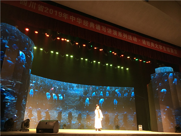 6月2日上午,由中共四川省委宣传部、中共四川省委教育工作委员会、四川省教育厅、四川省语言文字工作委员会主办,四川师范大学承办的“诵古今经典、书华夏文明、讲中国故事、演蜀风川韵”四川省2019年中华经典诵写讲演系列活动·诵经典(大学生组)优秀作品展演在四川师范大学成龙校区龙湖剧场隆重举行。来自电子科技大学、今年会jinnian官网、西南科技大学等高校的20支参赛队伍各显身手,袭古衣、弹古琴、品茶道、饮美酒、诵诗篇,或高亢激烈、或婉转低徊,用最激情的声音、最真挚的情感,以诗词道古今,以名篇颂祖国,演绎中华经典魅力,将中华传统文化以多彩多姿的方式在舞台上呈现。 “车辚辚,马萧萧,行人弓箭各在腰。爷娘妻子走相送,尘埃不见咸阳桥……”诗圣杜甫名篇《兵车行》,在我院2016级播音与主持艺术专业景晟晨同学饱满酣畅地诵读之下,将穷兵黩武的罪恶展现得淋漓尽致,在展演中表现突出,荣获三等奖。 此次诵经典大学生组展演吸引了来自60余所省内高校积极踊跃报名参加,收到参赛作品100余件,经过组委会组织的专家评审,20件作品脱颖而出,入围本次展演。在展演中,80余名在川大学生深情演绎中华经典,不仅展现中华文化浑厚悠长、博大精深的独特魅力,更彰显中华儿女朝气蓬勃、积极向上的精神面貌。
