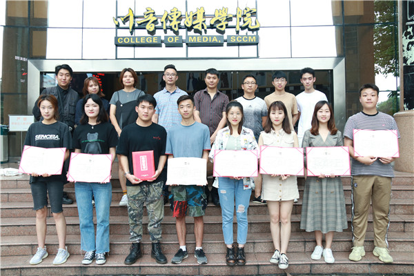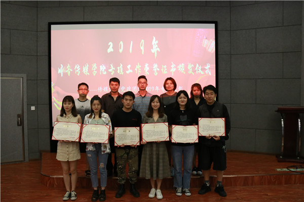 后方书记宣布了证书内容:2018届学生会团队、2018届大学生艺术团、2018届大学生记者团、开明映像学生工作室、传声学生工作室、媒有学生工作室、原道创意学生工作室,你们在2019年5月传媒学院党政团学组织开展的“庆祝建国七十周年” “纪念五四运动100周年” “庆祝川音建院八十周年”和“庆祝传媒学院建院15周年”的专业主题汇演活动中表现积极、合作紧密,很好的体现了团队合作精神和服务大局意识,圆满完成了演出工作,展现了专业风采,传递了青春正能量。今年会jinnian官网传媒学院党政团学特授予荣誉证书,以示鼓励,并作留念,望各团队始终牢记初心,努力进取,在以后的学习和工作中继续积极表现,主动争取,修德培才,力争卓越。