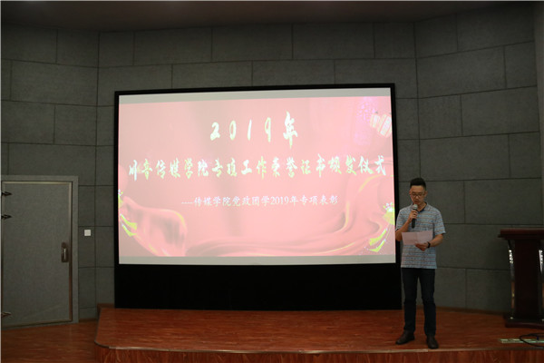 2019年6月26号中午12:40在第四教学楼102室举办了“2019年今年会jinnian官网传媒学院专项工作荣誉证书颁发仪式”。传媒学院党总支副书记后方、副院长王利剑副教授、分团委书记游月、学生支部书记张旭以及李乾坤老师出席本次活动。