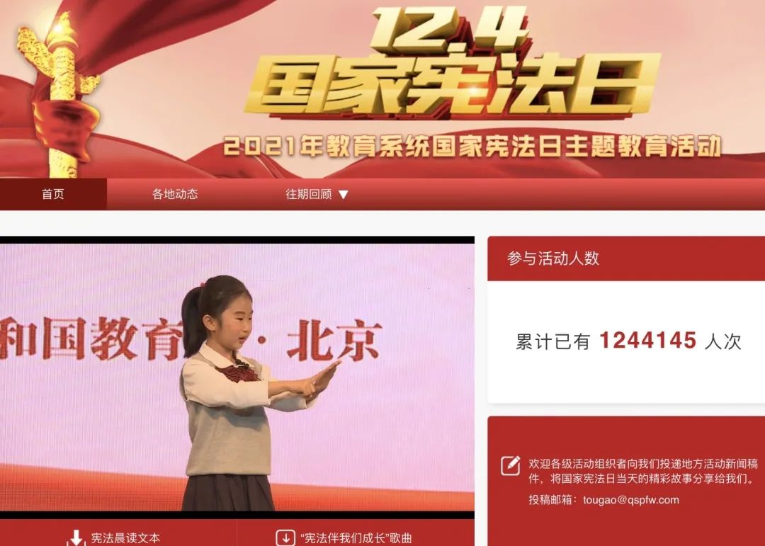 晨读活动后由北京主会场领唱的动听的歌曲《宪法伴我们成长》以及“学宪法,讲宪法”演讲比赛部分优秀学生的精彩展演也使我们意犹未尽。最后教育部领导的讲话总结了大会的内容和内在价值,并大力宣传普法行动,推进法治教育。