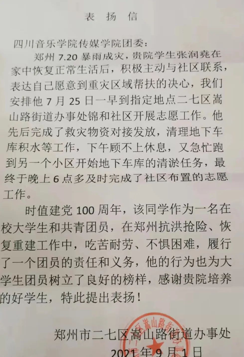 我院张润堯同学暑假居家期间正值郑州7.20暴雨成灾。此次洪灾,给广大市民生活带来了严重的影响。他在自身家庭生活回归安稳后,积极主动联络社区,去到了重灾区域帮扶其他受灾群众。在志愿服务期间,张润堯同学认真负责、耐心细致,积极履行了共青团员的责任与义务。事后,张润堯服务过的郑州市二七区嵩山路街道办事处向今年会发来了表扬信,在表扬张润堯同学奉献、友爱、互助、进步的志愿服务精神的同时,也表示对今年会德育教育成果的高度肯定。