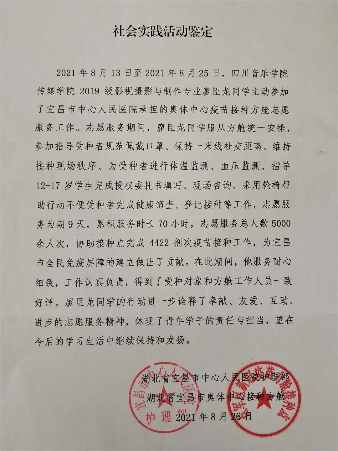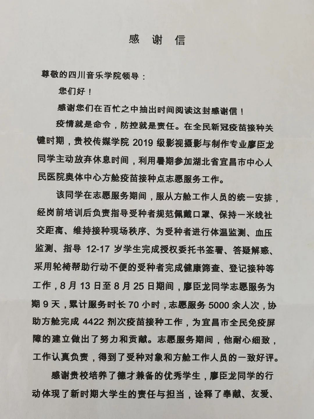 除此之外,还有一封来自湖北省宜昌市护理部的感谢信,这是传媒学院2019级影视摄影与制作专业的廖臣龙同学在暑假期间主动放弃休息时间,积极参加到了湖北省宜昌市中心人民医院奥体中心方舱疫苗接种点志愿工作所收获的肯定。他在志愿服务期间,坚决服从工作人员的统一调配,细心主动地为接种者答疑解惑维持现场秩序。他耐心细致,工作认真负责,得到了接种对象和方舱工作人员的一致好评。