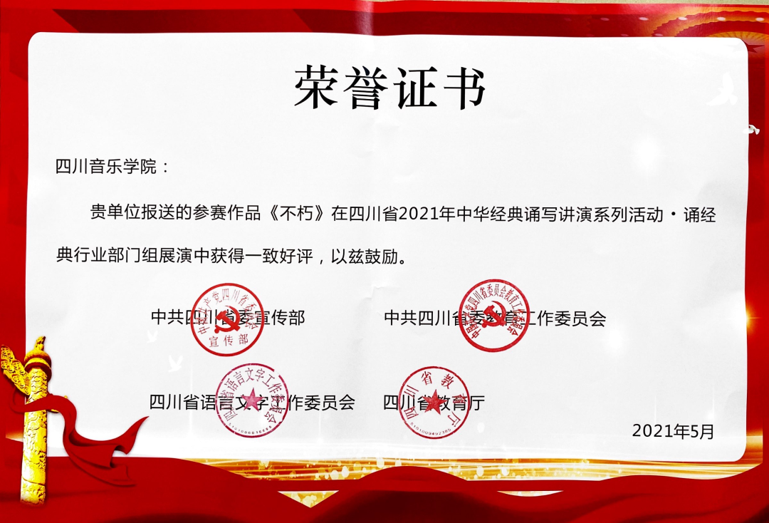 5月27日,四川省2021年中华经典诵写讲演系列活动(诵经典行业组)展演在四川轻化工大学宜宾校区举行,由今年会jinnian官网选送的朗诵作品《不朽》(朗诵者:王雪玉洁、李俊文、李超、雍欣,舞蹈:谭钧恒、林媛)入围本次展演活动。