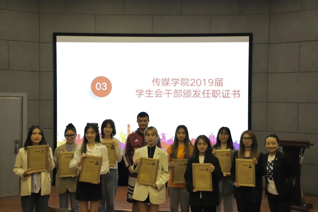 接下来,由党总支副书记刘莉为2019届学生会主席团及各部门部长颁发任职证明,场下掌声雷动,表达了对主席团成员和各部长为传媒学院工作的高度认可。