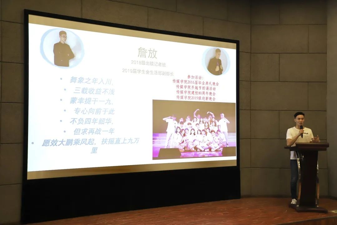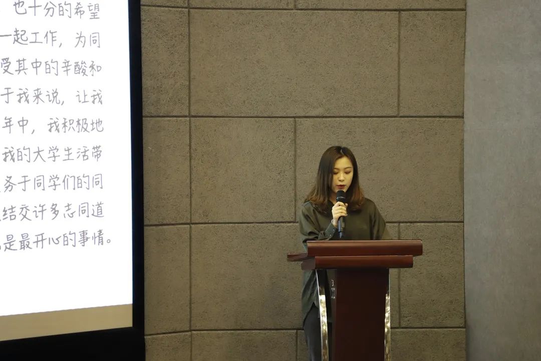 好学生会的先进氛围。最后,由刘莉书记进行总结致辞。她对传媒学院的总体氛围进行了高度评价,同时也提出了对学生会干部的几点要求。书记对成功竞选的主席团成员表示了祝贺,希望学生会成员能够保持自己的初心,在工作上更加地严谨,更好地为学院服务。在大会结束之际,刘莉书记表达了希望2020届学生会能够扛起重担搞好工作争取作为明年建党100周年献上最好的礼物。