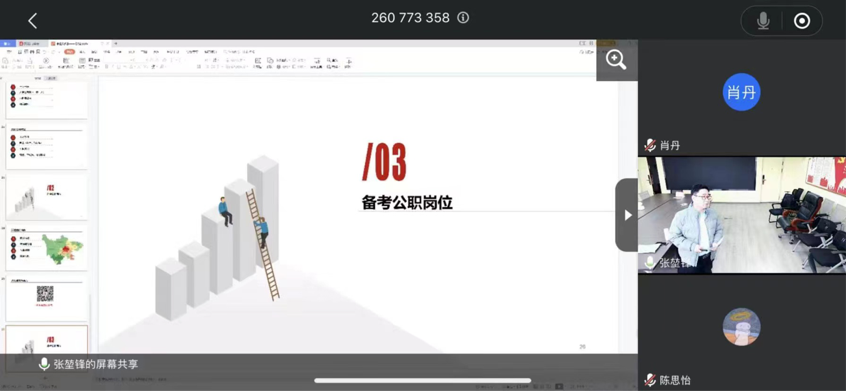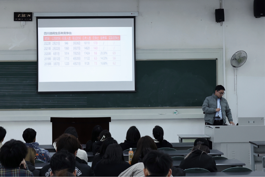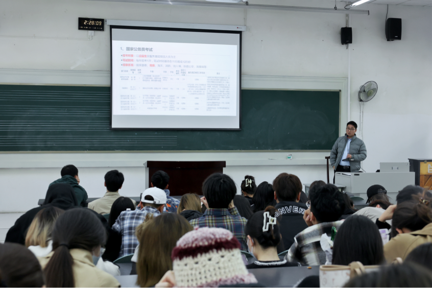 其次,张老师重点讲解了“认识公职岗位”的内容,分别介绍了公务员、事业单位和服务基层项目的考情,从考试形式的时间、笔面试内容、难度等方面做了深入细致的讲解,尤其是针对选调生考试,张老师强烈推荐学生们备考。之后,张老师向同学们简要说明了报考流程和其中可能会遇到的问题与困难,减少了同学们的报考风险。