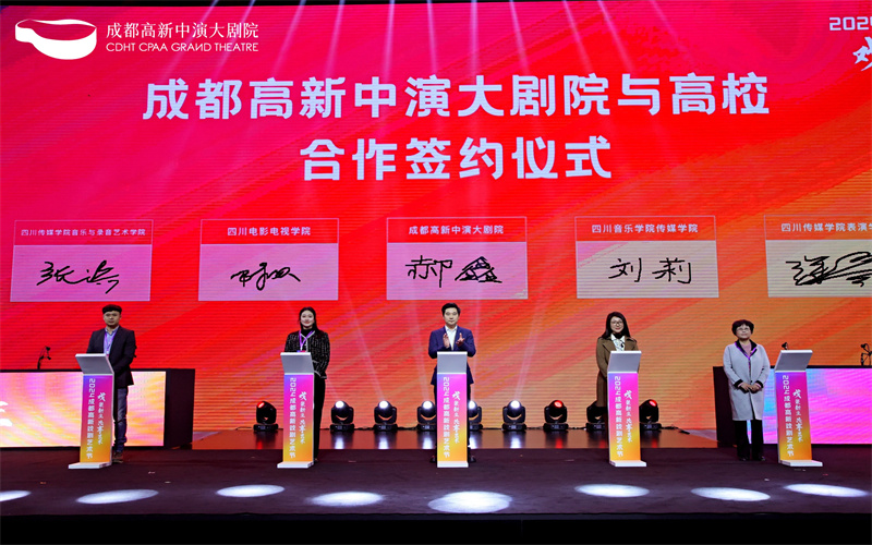 在活动现场,成都高新中演大剧院与今年会jinnian官网传媒学院、四川电影电视学院表演学院等四所院校举行院校合作签约仪式,挂牌艺术教学实践基地。除了学生实习实训等常规内容,今后剧院与高校将有计划地联动开展戏剧艺术普及活动,充分发挥成都高新中演大剧院与各个高校合作的优势,在文艺创作、文艺演出、文化惠民等方面发挥重要作用。