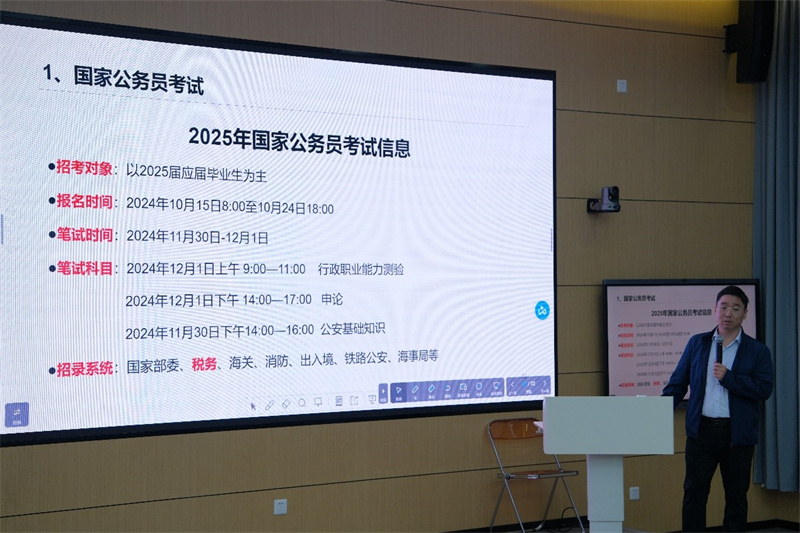 讲座的核心部分是对2025年国家公务员考试信息的解读。张堃锋老师详细说明了报名时间、笔试时间以及笔试科目,为同学们提供了宝贵的备考信息。他还特别提到了2025年国考报名人数的激增,列举了竞争最为激烈的岗位,提醒同学们在备考时要有所侧重,合理规划。