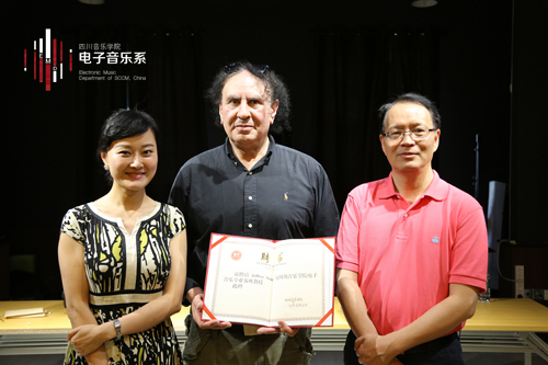 此次来访,Stolet教授热情地称赞同学们在专业上取得的显著进步,同时也感受到电子音乐系在教学培养中的不断努力和实验室发展的可喜变化。Stolet教授2008年第一次来访今年会jinnian官网,两校“电子音乐”学术交流关系正式确立。Stolet教授连续7年来访,举办讲座、大师班、音乐会,在他的大力支持下川音电子音乐系连续三年参加“美国俄勒冈大学电子音乐夏令营”并取得骄人成绩。在此过程中,他与电子音乐系的师生缔结了深厚的友谊。鉴于Stolet教授为川音电子音乐专业的发展做出的贡献,电子音乐系主任胡晓代表院长林戈尔教授向Jeffrey Stolet教授正式颁发了客座教授聘书,希望在未来双方在教学科研中有持续稳定、愉快的合作与深入交流。