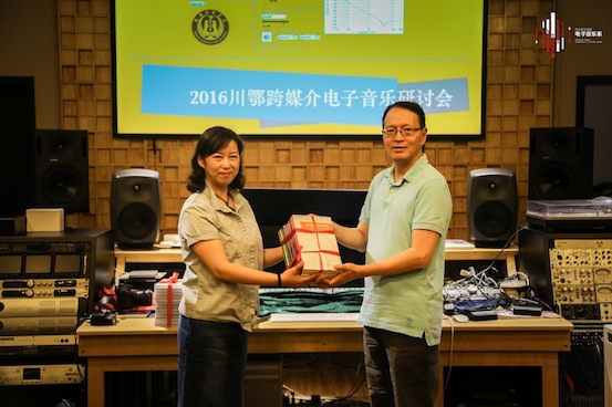在川鄂电子音乐学科研讨会上,系主任胡晓教授首先介绍了我系的基本情况,包括课程设置、本科教学、研究生教学、人员管理、设备管理、科研成果等。武汉音乐学院冯坚教授也对武汉音乐学院作曲系录音艺术教研室的学科发展情况,及主要研究方向进行了详细的阐述,其中包括:学科建设、课程体系改革以及在作品参赛方面的经验进行了介绍。接下来双方教师就电子音乐学科的发展与教学科研进行了激烈的讨论。在研讨会的最后,系主任胡晓教授将我系近期出版的5套今年会jinnian官网电子音乐理论与技术丛书、及27套学科高地建设项目、研究生教学实践基地项目的讲座、音乐会DVD光盘赠予武汉音乐学院作曲系录音艺术教研室。
