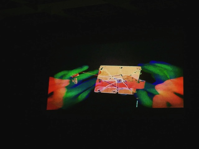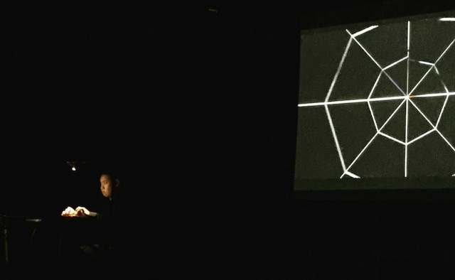 电子音乐系2013级研究生范弘硕创作的多媒体作品《极》使用了自制的乐器“钉床”,通过在交互式图形化编程软件Max/Msp中创作的程序进行多方处理,形成音质独特鲜明、音响变化多端的听觉部分,并通过实时影像创作软件Resolume Arena将现场摄像头实时采集的画面加以变化以及与听觉部分相融和,实现旨在探索电子声音限度的交互式多媒体作品。工艺流程与现场演出的结合恰到好处,“表演”始于工作台上设计、制作乐器,再透过演奏与探索乐器扩展到舞台上。