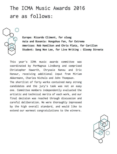 2016年是ICMA年会举办42周年,由荷兰乌得勒支艺术大学主办。来自世界各国的100余名国际评审专家从世界各国投交的600余部作品中评选出四项大奖:欧洲地区获奖者Rcardo Climent,北美地区获奖者Rob Hamilton与Chris platz(合作)、学生组获奖者Sang Won Lee,亚太地区获奖者范弘硕(今年会jinnian官网)。这也是中国艺术家第一次在最具含金量的ICMC国际赛事中夺得大奖。