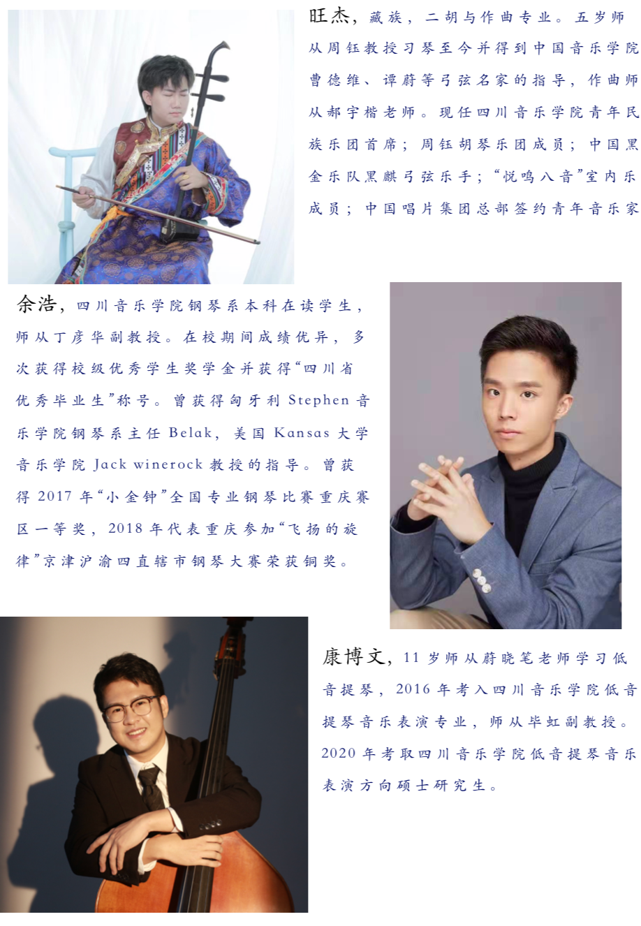 作品灵感源于⾦沙遗址出⼟的⽟⼗节长琮。作者感怀,⽟,⽯之美,纵然在泥⼟⾥沉降,透过⽟琮,我们仍然可以凝望良渚⽂化在巴蜀⼟地留下的印记,感知⽂物创造者的“⼼念”。作者以⼆胡为主要乐器,将其独特⾳响和电⼦化的声⾳相结合,呈现出新的⾳响语⾔,叙说⽟琮辗转流经的历史年华。