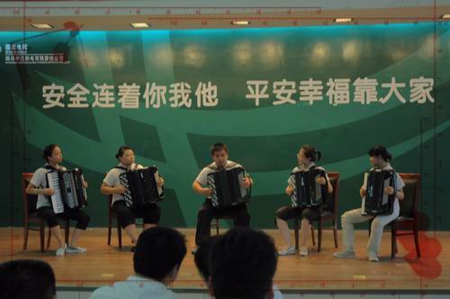 参观完毕后,师生们来到四川中江供电有限公司办公大楼,即将在此献上我们最特别的祝福与感谢。在布置好舞台后,每个同学都很快的进入了自己的角色,舞台上演出的同学卖力的演出,舞台下负责后勤的“武工队”也是忙的汗流夹背,但是大家无怨无悔,那股认真劲儿,让在座的各位贵单位领导非常感动。节目一个接着一个,台下大家的阵阵掌声与欢笑声不断,映像最深刻的就是魔术和获得手风琴世界杯大奖的几名同学的精彩演奏,台下的观众积极参与、互动让小小的会议室充满了我们的欢笑。演出结束后,同学们向灾区的小朋友赠送了学习用品和生活用品,获得了灾区同志们的一致好评。他们的刘书记诚挚的邀请我们以后多去中江进行演出和社会实践,此次我们建立了友好的、长久的合作关系。