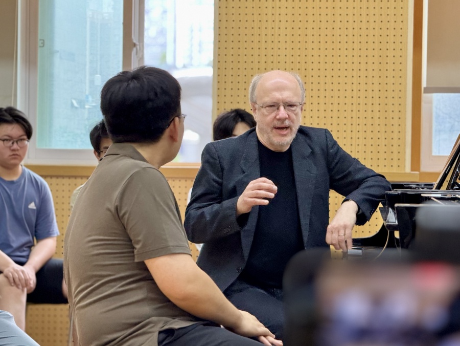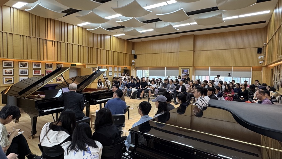 在大师课上,科布林教授以拉赫玛尼诺夫《第二钢琴协奏曲》和李斯特《匈牙利狂想曲No.12》为范例,以极具启发性的提问与讨论的方式提出钢琴演奏须以准确诠释谱面为根基;音乐的发展与走向需以内在气息情感作支撑;技术展现均以表现音乐形象为最终目的等多维度问题,让我们对钢琴艺术所涵盖的宽度有了更深层次的理解。而哈默林教授则以斯特拉文斯基的《彼得鲁什卡》和拉威尔的《夜之幽灵》为教学载体,通过精湛的现场演奏与精准独到的讲解,为在场师生带来了一场高水平的艺术指导。作为集演奏、作曲与教育于一身的艺术大家,他从多重视角深入浅出地解析作品,令在场师生们深受启发、获益良多。