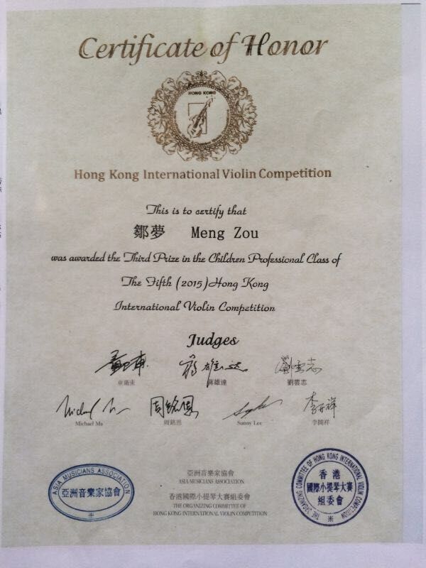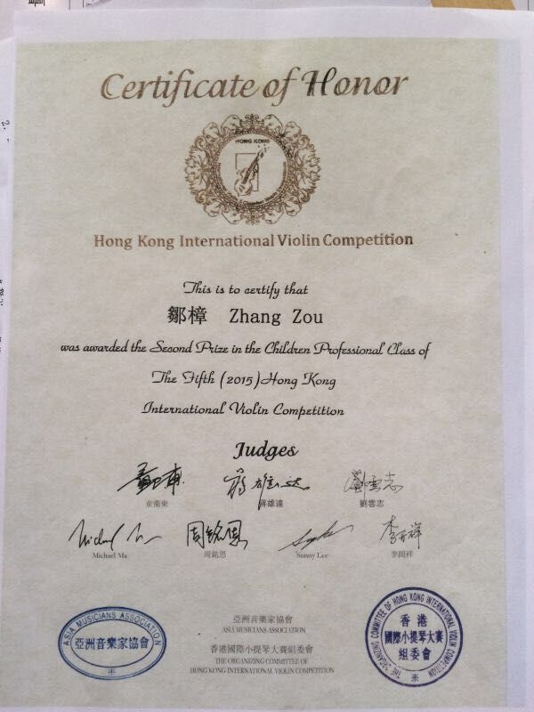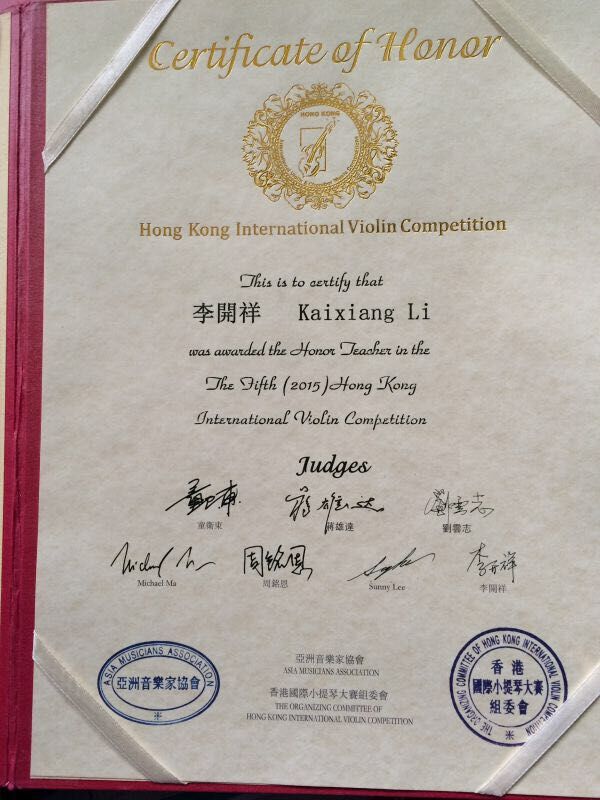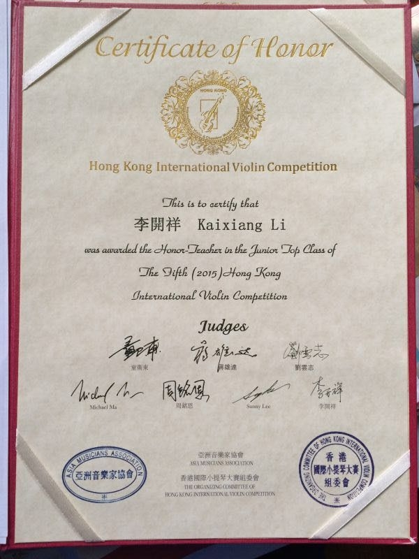 香港国际小提琴大赛于2011年首创于香港,大赛评委来自中国、美国、加拿大、新加坡、香港、韩国,均为国际杰出的演奏家和教育家。 参赛的选手来自美国、台湾、新加坡、马来西亚、香港、韩国和中国大陆等地区,他们在比赛中展示了他们的才能和实力。 香港国际小提琴大赛为所有选手搭建了学习、交流和提升的舞台,这是一个公平、公正、公开的舞台,任何一位有音乐理想的学生都可以走上这舞台。很多青年选手也通过这个舞台申请到了理想的院校,或是走上了更高的音乐舞台。 著名小提琴家、教授,四川省音乐家协会理事,我系主任李开祥作为评委团的成员参与了这场赛事。同时,他的两名附中初一的学生邹梦和邹樟分别获得少儿专业组的第二、三等奖。李开祥教授作为他们的指导教师获得优秀指导教师奖。 通过参与这种国际赛事,我们才能找差距、共交流,才能为专业的提升打下坚实的基础,为提升专业品质做出不懈努力。