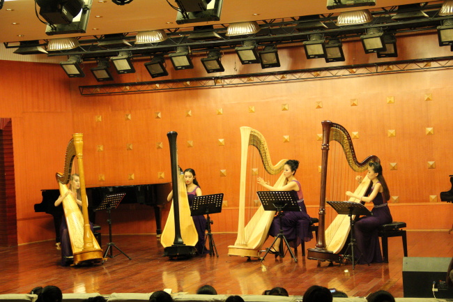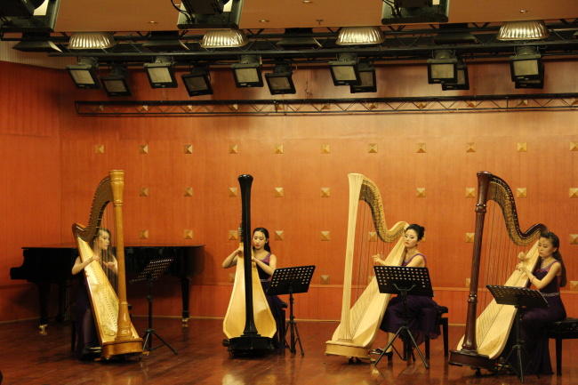 2015年6月2日,管弦系竖琴教师徐子珊在我院星海音乐厅,成功举办了由徐子珊本人领衔演奏的竖琴重奏音乐会。 竖琴对很多人来说是一个神秘的乐器,今晚的竖琴重奏音乐会便揭开了它的神秘面纱,将美妙动听的音乐完美展现给了观众。四台竖琴的重奏演奏形式,别具匠心,让人耳目一新,效果优美大气。 音乐会的开场,以大家耳熟能详的作品德彪西“随想曲”,由竖琴、长笛和大提琴合奏,这首作品的演奏给听众带来无限美感,旋律极其优美,演奏得恰到好处,是难得的佳作。其余所有作品皆由四台竖琴同时演奏完成,经典的有:巴赫“玛利亚”、门德尔松“歌声翅膀”、还有竖琴最著名的“卡农”等,徐子珊老师等人的精彩演绎将这些作品的音乐带进了观众内心,感受音乐之美。让观众领略到了竖琴纯正音乐的风采。 这次的竖琴重奏音乐会的成功演出,表明徐子珊在竖琴艺术的追求上,开拓思路,不断进取的精神,希望能继续创造出新的成就。