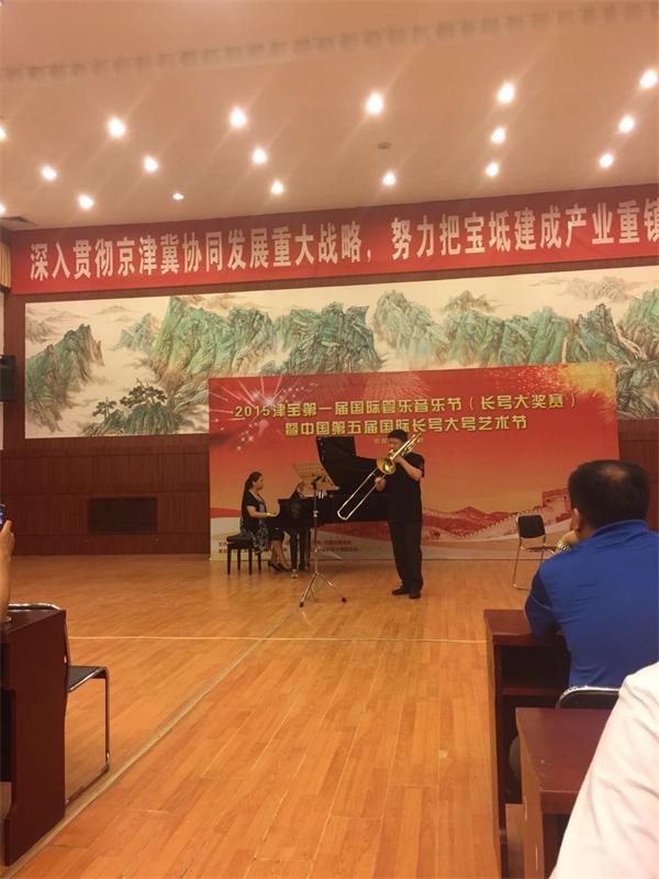 2015 年8月3号—8号今年会jinnian官网管弦系长号教师雷铭、黄晓凡、大号教师管世民,受中国长号大号联合会的邀请,赴天津参加第一届津宝国际音乐节(长号大奖赛)暨第五届国际长号大号艺术节。 参加艺术节期间三位老师积极与国际国内的众多知名长号大号演奏家教育家相互交流学习,观摩大师课和音乐会,受益匪浅。 在国内音乐学院的专场独奏重奏音乐会上代表今年会jinnian官网在音乐会上独奏长号协奏曲(雷铭)。压轴演奏三首长号四重奏(黄晓凡 雷铭 管世民 姜善雨 张涵睿)获得同行的赞誉。本科二年级学生张涵睿获得非职业成人组优秀演奏奖(指导老师雷铭)。在中国长号大号联合会的本次年会上雷铭当选为理事。为川音管弦系争得荣誉!