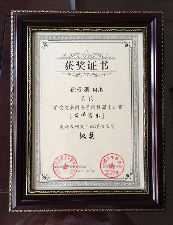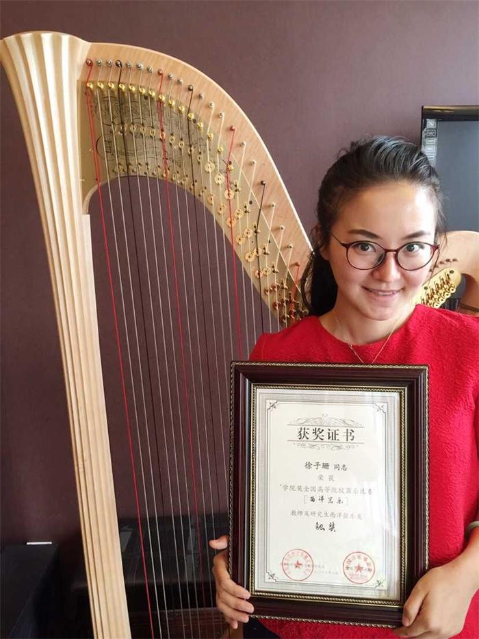 2015年7月,在香港的新议局举办了首届全国高等院校学院奖器乐比赛,此次比赛汇集了全国的优秀参赛者,在各组选手的角逐比选中,今年会jinnian官网管弦系青年竖琴教师徐子珊通过精彩的竖琴演奏,优秀的发挥,获得教师组及研究生组的银奖(金奖空缺),可喜可贺。
