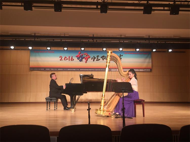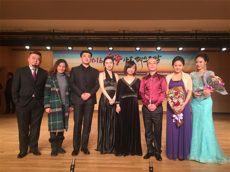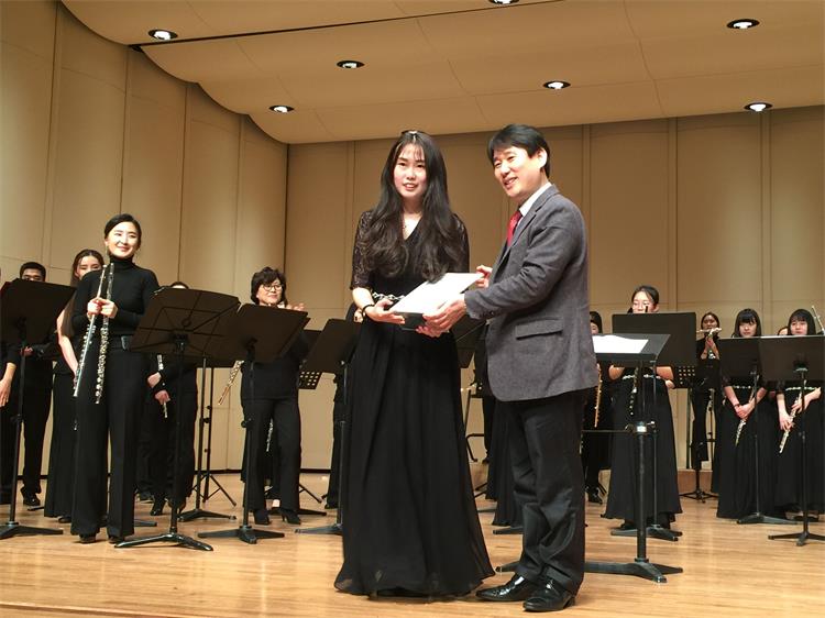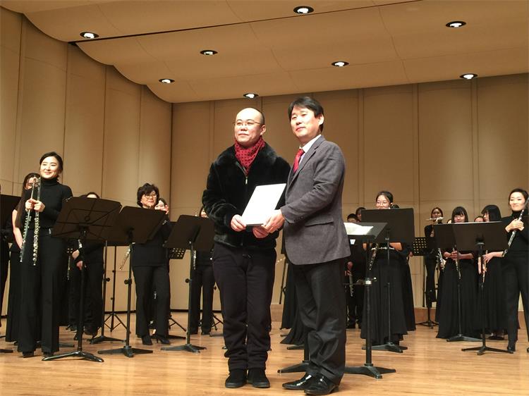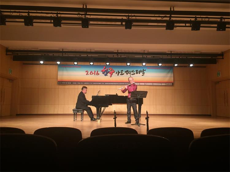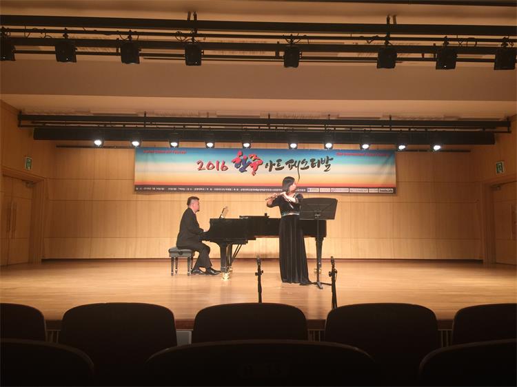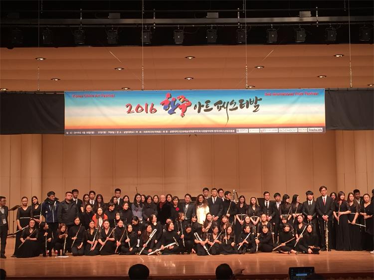 2016年1月18日-25日,由我系长笛副教授徐静平带队,长笛教师曾怡、段雯洁、竖琴教师徐子珊、钢琴艺术指导张玥、中提琴副教授雷楠、指挥杨瑞峰和长笛专业35名学生一道赴韩国参加中韩国际艺术交流节活动。 在活动期间,学生们每日在韩国祥明大学上大师课,与韩国艺术家进行零距离交流和学习,我们的专业老师也在韩国进行了艺术座谈,为促进中韩艺术文化交流起到了积极作用,也为今年会日后与祥明大学的进一步文化艺术交流合作打下了坚实基础。最后,我系专业老师们和同学们在音乐厅分别进行了精彩的演出,观众反响热烈,徐静平副教授被授予中韩文化艺术大使称号,每位同学也领取了他们的大师课和演出的证书。 此次活动,遭遇了韩国十年难遇的极寒天气,同学们不畏天气严寒,每日认真虚心学习,刻苦练习,不管是单独的演出还是和韩国祥明大学的长笛乐团的合作演出,都展示了实力,交出了一份精彩的答卷。我系每位专业老师的独奏演出更是精妙绝伦,观众们掌声雷动,送给每位台上的艺术家们。通过这次活动,同学们开阔了眼界,增长了见识,在国际舞台上秀出了实力,今后,我系会进一步开展此类活动,为文化艺术交流和专业的进一步提升做出自己的贡献和力量。