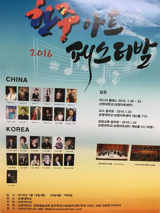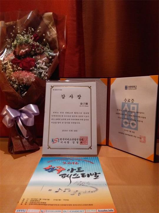 2016年1月18-25日,管弦系竖琴副教授徐子珊随学院教师赴韩参加在韩国首尔祥明大学举办的第二届中韩艺术节交流活动,在音乐会上,演奏巴赫的两首竖琴作品,受到观众和音乐同仁们的好评,并获得政府颁发的证书。并与韩国祥明大学的各类音乐教授进行了交流,促进了中韩双方在音乐方面共识与探讨,期望以后双方的音乐交流更加深切。