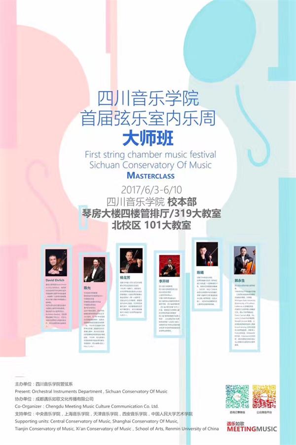 2017.6.3至2017.6.10由管弦系主办的首届弦乐室内乐音乐周落下帷幕,活动邀请了David ehrlich、杨戈芳、李开祥、陈曦、郭永生数位专家教授为来自川音、西安、天津音乐学院的同学们授课。本次室内乐音乐周作为小、中提琴教研活动之一,教研室积极组织老师听课,安排学生上课。 活动期间系主任李开祥教授为西安、天津等学生们授课,并与小、中提琴教研室李倩、袁源、苏光跃老师以及钢琴艺术指导张玥老师、大提琴赵明玮老师、单簧管孙震老师、川音交响乐团丁铌、王楚等老师们共同排练演出导师专场音乐会。