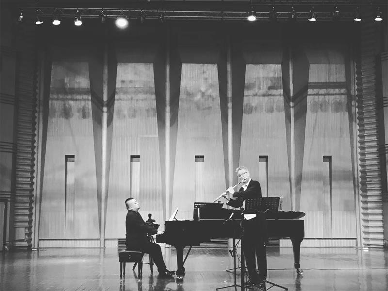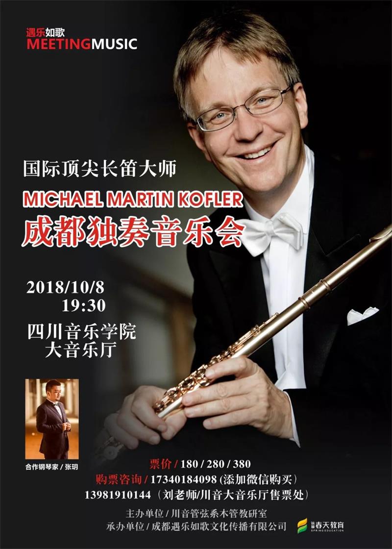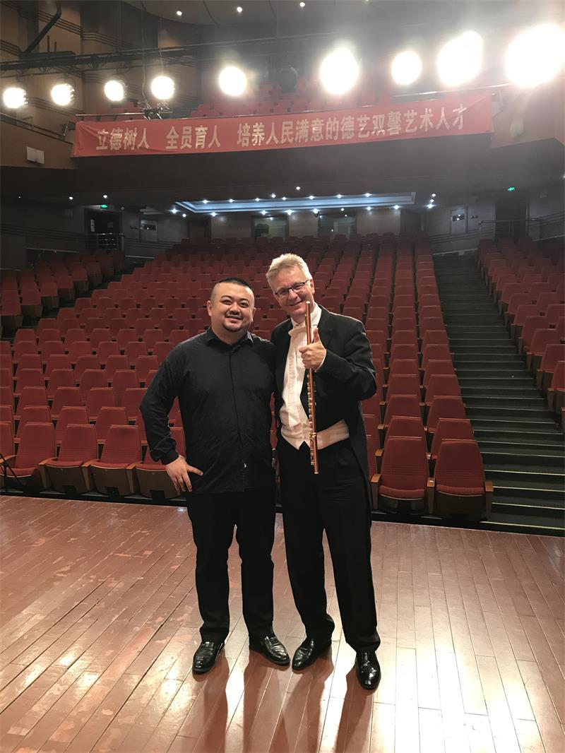由川音管弦系木管教研室主办,成都遇乐如歌文化传播有限公司承办的德国慕尼黑爱乐乐团长笛首席世界著名长笛演奏家麦克·马汀·科夫勒( Michael Martin Kofler)先生成都独奏音乐会圆满成功,我系钢琴艺术指导教师张玥与木管教研室主任徐静平副教授受艺术家邀请共同圆满的完成了整场音乐会以及返场,精湛的技艺跟敏锐的音乐直觉获得了大师的赞誉。音乐会后第二天,艺术家又不辞辛劳的为川音长笛专业的学生进行公开授课讲座,其非凡的专业造诣和亲和的为人让学生们都受益匪。