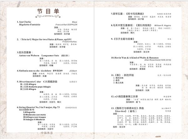 2019年6月18日晚7:30由我系室内乐教研室主办的“室内乐音乐会”在星海音乐厅成功举办。我院孙洪斌副院长及管弦系主任蔡宇教授莅临指导并观看了演出,音乐会持续了两个半小时,共有十三个重奏组上演了曲风多元、乐器组合丰富多彩的曲目。 音乐会上不仅囊括了弦乐四重奏、木管五重奏、长笛重奏、小号重奏、木笛重奏,还有单簧管与弦乐、双簧管与弦乐的五重奏,以及单簧管室内乐团等组合,经过一个学期的排练,同学们在舞台得到了实践经验,增强了室内乐演奏技艺与自信,也收获了在场师生的一致好评。