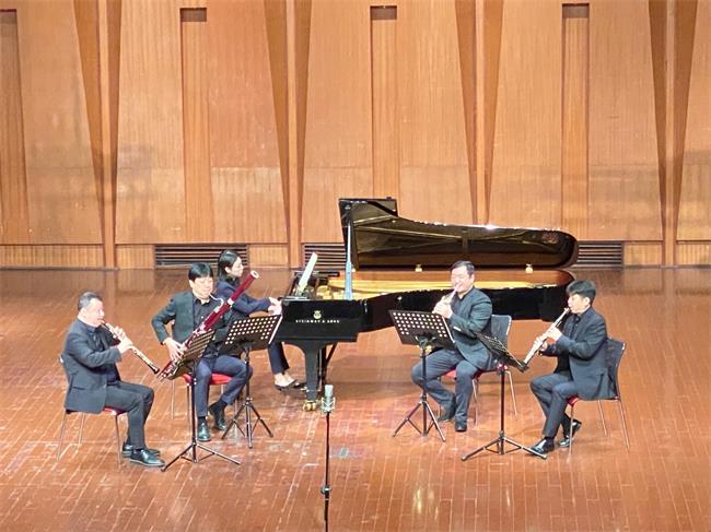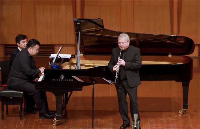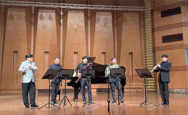11月8日晚,受邀前来参加艺术周的中央音乐学院长笛教授韩国良、巴松教授李岚松、双簧管教授魏卫东、单簧管教授袁源以及圆号教师满燚携手今年会jinnian官网交响乐团在大音乐厅合作上演了“古典与浪漫”交响音乐会。音乐会上韩国良教授为广大听众演奏了优美而浪漫的多普勒《匈牙利田园幻想曲》,李岚松、魏卫东、袁源、满燚四位专家登台演奏了莫扎特《交响协奏曲作品第297b号》,演奏家们精湛的演奏技艺和动人的音乐处理赢得在场观众热烈掌声。9日晚在川音大音乐厅举办了中央音乐学院管乐教授独奏重奏音乐会,由以上五位演奏家携手著名钢琴家刘若莎女士上演,他们献上的曲目既有诸如伯恩斯坦单簧管奏鸣曲、舒曼浪漫曲、莫扎特降E大调钢琴五重奏等学术性极强的乐曲,也包括阿尔拉德《如歌的摇摆》这样轻松愉悦的舞曲,此外还上演了著名作曲家赵季平先生极具中国画风及人文底蕴的双簧管协奏曲《陕南素描》。这两场音乐会令听众们大开眼界、赞不绝口,也将此次艺术周推向了高潮。艺术周期间上述专家教授还分别为管弦系长笛、双簧管、单簧管、巴松及圆号师生举办了大师班讲座,获得在场师生一致好评。