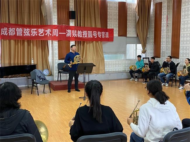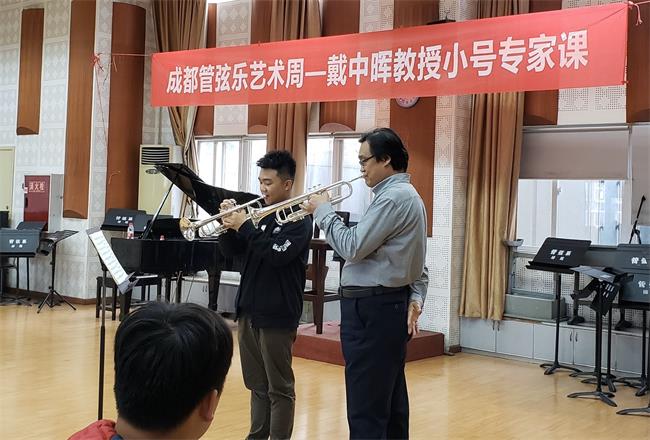 11月6日至8日,中国音协管乐学会主席、中国交响乐基金会理事、国家一级指挥、中国人民解放军军乐团原团长于海;中央音乐学院教授、博士生导师、原中央音乐学院管弦系主任赵瑞林;国际著名小号演奏家、中国音协管乐协会副主席、中央音乐学院教授、博士生导师戴中晖三位专家分别在川音大音乐厅和学术交流中心为我院师生举办了爱国主义主题教育《我们的国歌》、《西方管乐艺术史》和《管乐的训练与发展》三场大型讲座,讲座受到师生们热烈欢迎,会场座无虚席,师生们纷纷表示从讲座中获益匪浅。艺术周期间赵瑞林、戴中晖两位专家还分别对管弦系长号、小号专业学生进行了大师指导。