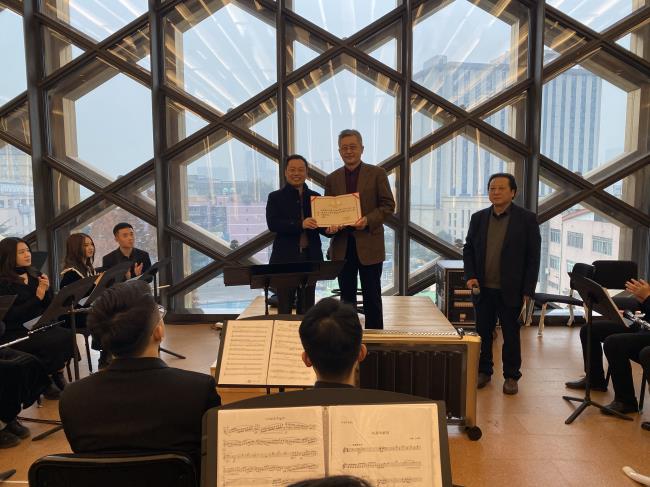 2019年12月13日,聘任于海教授为我系交响管乐团艺术顾问、特聘教授仪式在城市音乐厅5楼排练厅举行。我院党委常委、副院长孙洪斌讲话并进行受聘仪式,我系领导及管乐团相关负责老师到会参加。受聘仪式由管弦系党总支书记、系主任蔡宇主持。