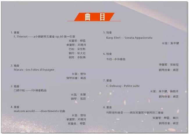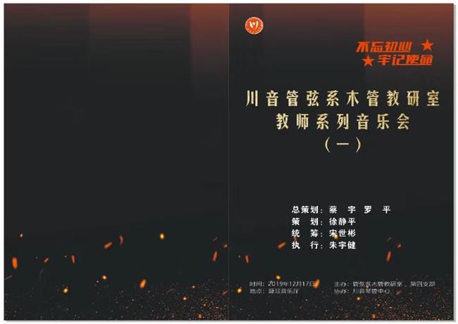 2019年12月17日,在即将辞旧迎新之际,川音管弦系木管教研室教师音乐会在聂耳音乐厅成功举行。木管教研室的教师们用重奏、独奏等丰富的表演形式,给听众们带来了精彩的音乐享受,把西洋木管乐器的魅力展现得淋漓尽致。作为教师,既要言传,也要身教。这样的音乐会形式,即团结锻炼了教研室的教师队伍,也对学生们起到了良好的示范启示效应。今后,每个学期我们教研室都将举行教师音乐会,不忘初心,牢记使命,让艺术走上舞台,在舞台上锤炼教师的专业水平,用实际行动做好学生们的先锋模范!