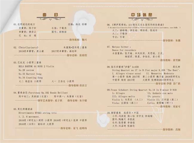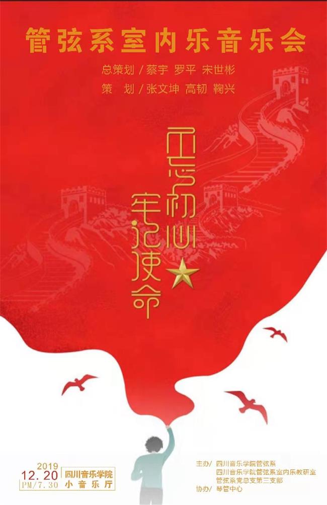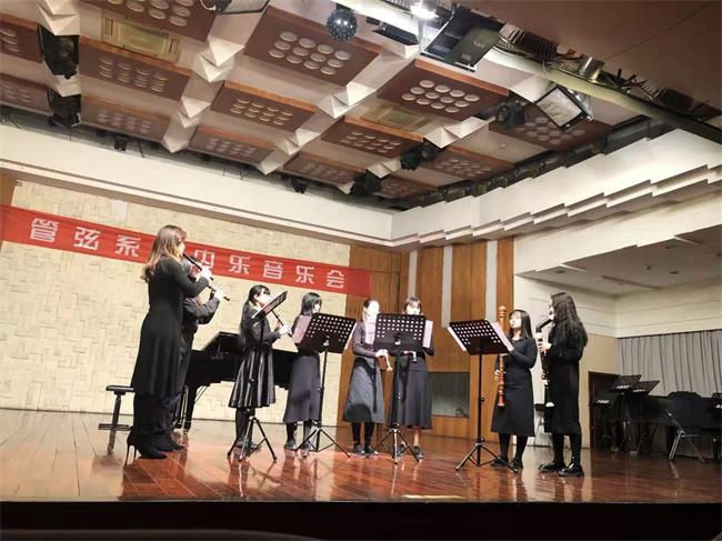 我系室内乐音乐会于2019年12月20日在川音小音乐厅成功举办。本场音乐会结合不忘初心,牢记使命主题教育,共有十个重奏组登台演奏,包括木管重奏、铜管重奏、弦乐四重奏等多种组合形式轮番登场,获得在场师生的热烈欢迎!音乐会在铜管重奏《我爱你 中国》的旋律中结束。同学们通过这次登台亮相,检验了在本学期重奏课程中所学的技能,充实了舞台实践经验。