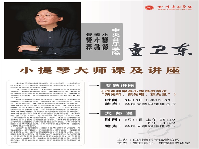 6月10日--11日,中央音乐学院管弦系主任、小提琴教授、博士生导师童卫东教授应邀来我院为管弦系师生举办讲座及大师班。