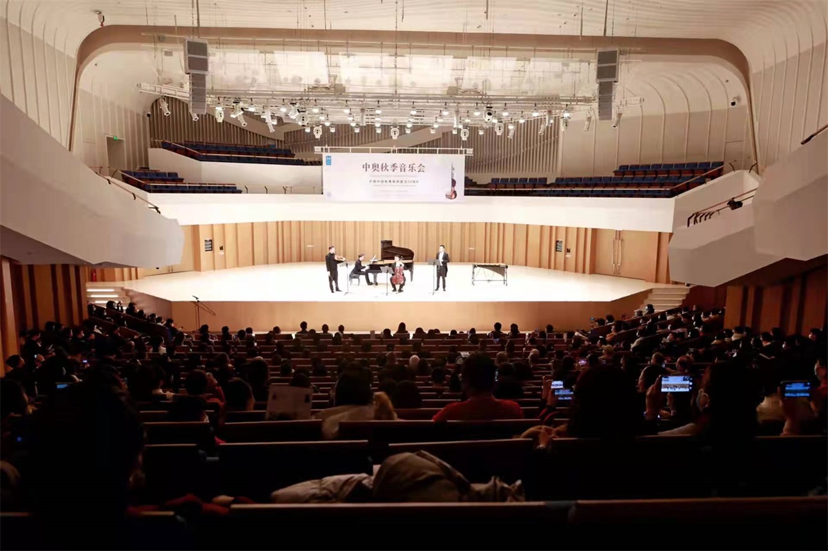 12月7日,为庆祝中国和奥地利建交50周年,2021成都·欧洲文化季——中奥秋季音乐会在中国-欧洲中心上演。音乐会由成都市人民政府外事办公室、奥地利驻成都总领事馆主办,成都高新区新经济发展局、成都高新区国际合作投服局承办。 音乐会由我系鞠兴、赵明玮两位老师与现代器乐系莫翰音老师,以及来自成都大学中国-东盟艺术学院的奥地利青年小提琴家Tymur Melnyk、钢琴家Patrick Lechner联袂献上。
