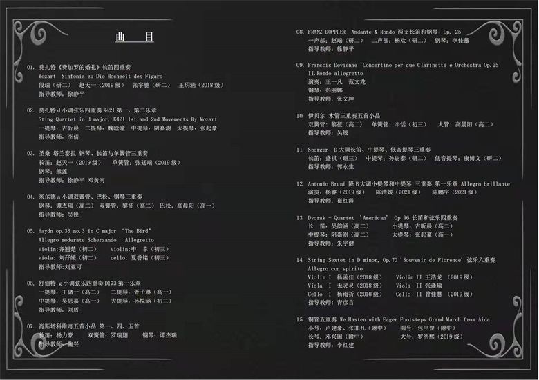 当晚共有包括管弦系本科、附中及研究生在内的十五个重奏组参与演出,他们的演出获得在场师生的一致好评。