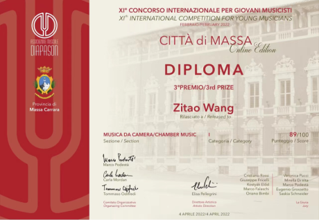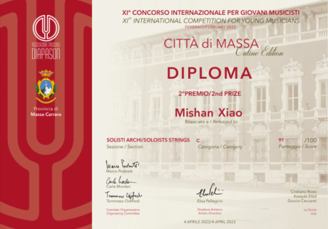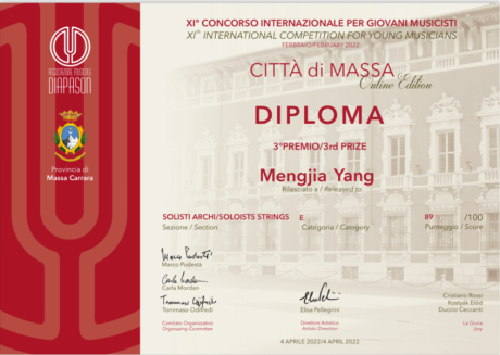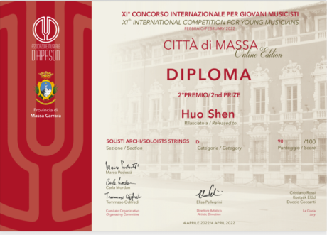 在近期结束的由意大利Diapason音乐协会举办第十一届“Città di Massa”国际音乐比赛中,我院小提琴、中提琴专业学生获得好成绩。