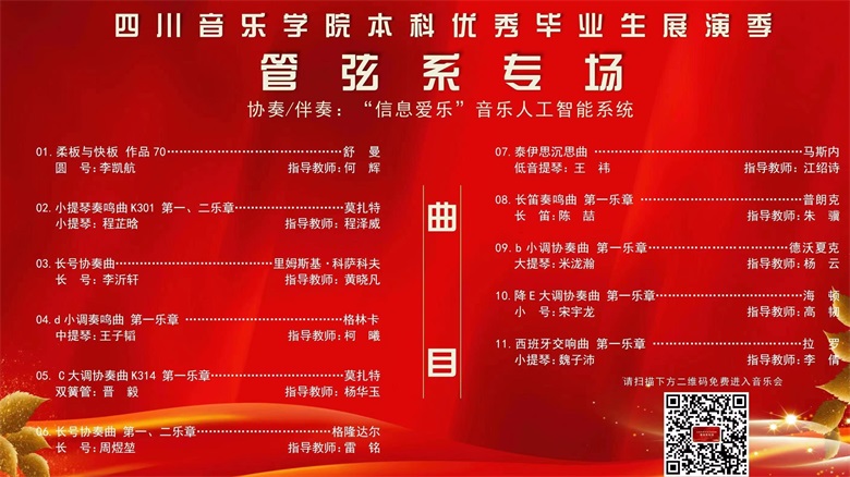 音乐会上共有11位管弦系优秀毕业生表演了包括九个专业方向的代表曲目,超过4000人在线观看了此次展演,收获了观众们的热烈欢迎和好评。