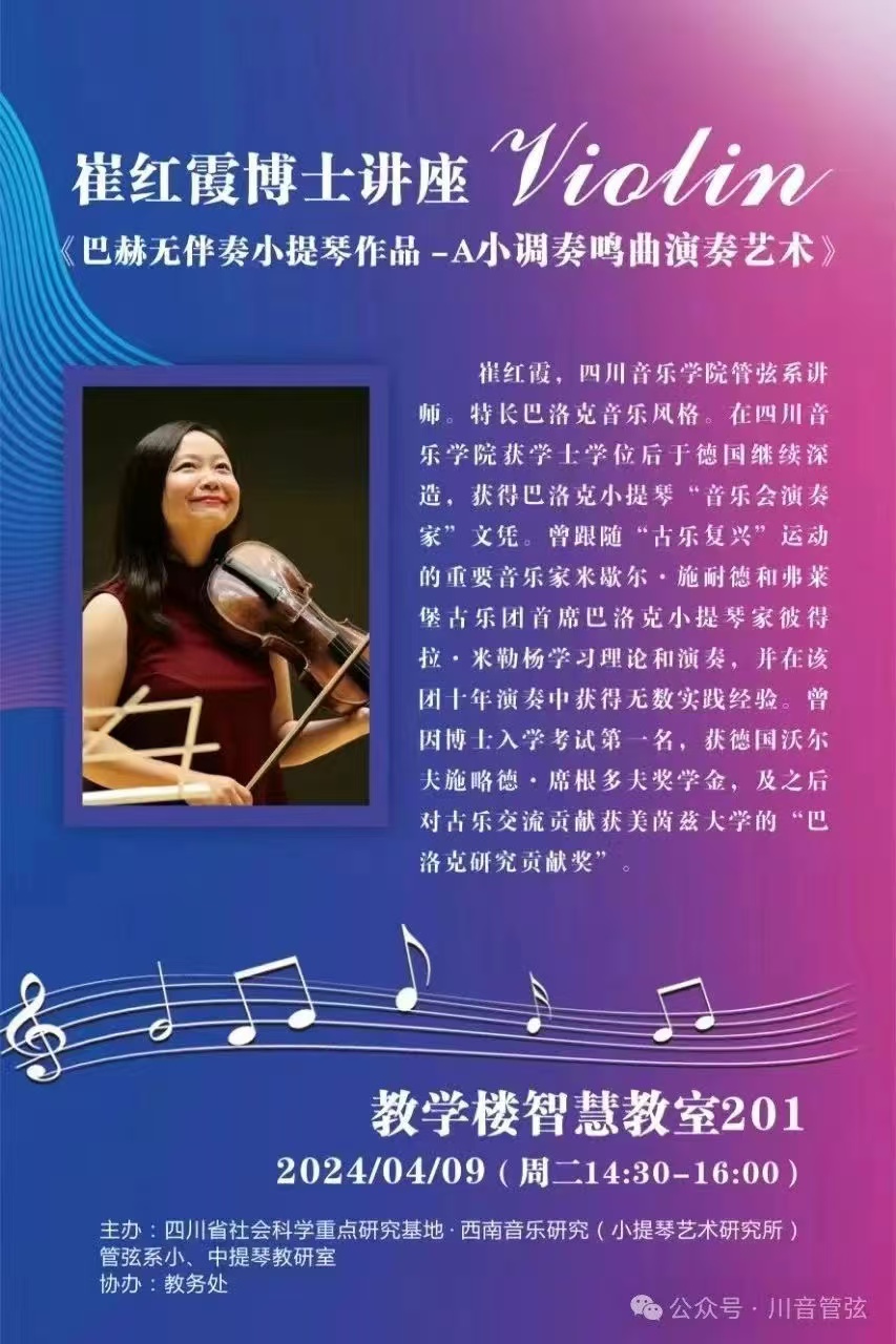2024年4月9日,今年会jinnian官网管弦系小中提琴教研室在智慧教室201开展了一场别开生面的教研室活动。旅德小提琴博士崔红霞担任主讲,详细讲解了《巴赫无伴奏小提琴作品-A小调奏鸣曲演奏艺术》,2022级学生谢佳宇(指导教师:李倩教授)示范演奏了巴赫第一奏鸣曲柔板。
